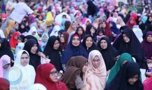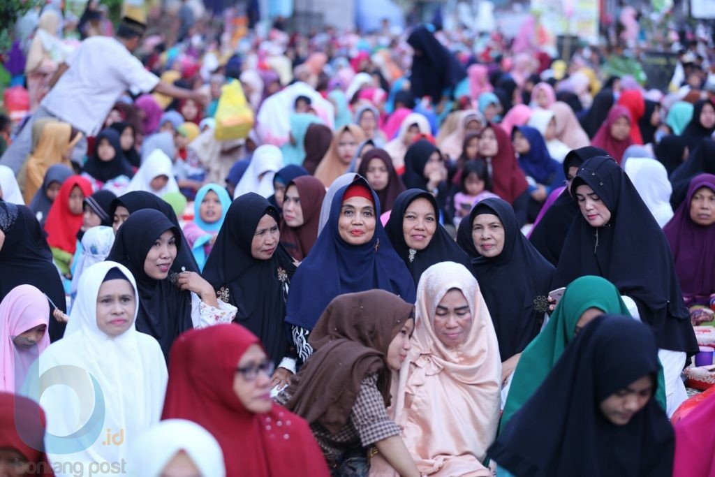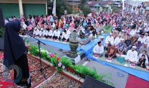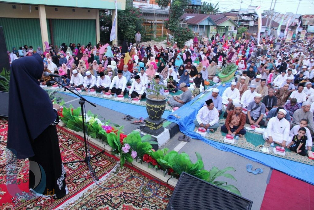 HUMAS PEMKOT APRESIASI KEGIATAN: Wali Kota Bontang Neni Moeniaeni saat menyampaikan sambutan di hadapan ribuan jemaah buka puasa akbar di sepanjang Jalan Agus Salim tepat di depan Masjid Asy Syuhada, Ahad (10/6) kemarin.