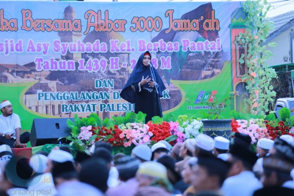 APRESIASI KEGIATAN: Wali Kota Bontang Neni Moeniaeni saat menyampaikan sambutan di hadapan ribuan jemaah buka puasa akbar di sepanjang Jalan Agus Salim tepat di depan Masjid Asy Syuhada, Ahad (10/6) kemarin.