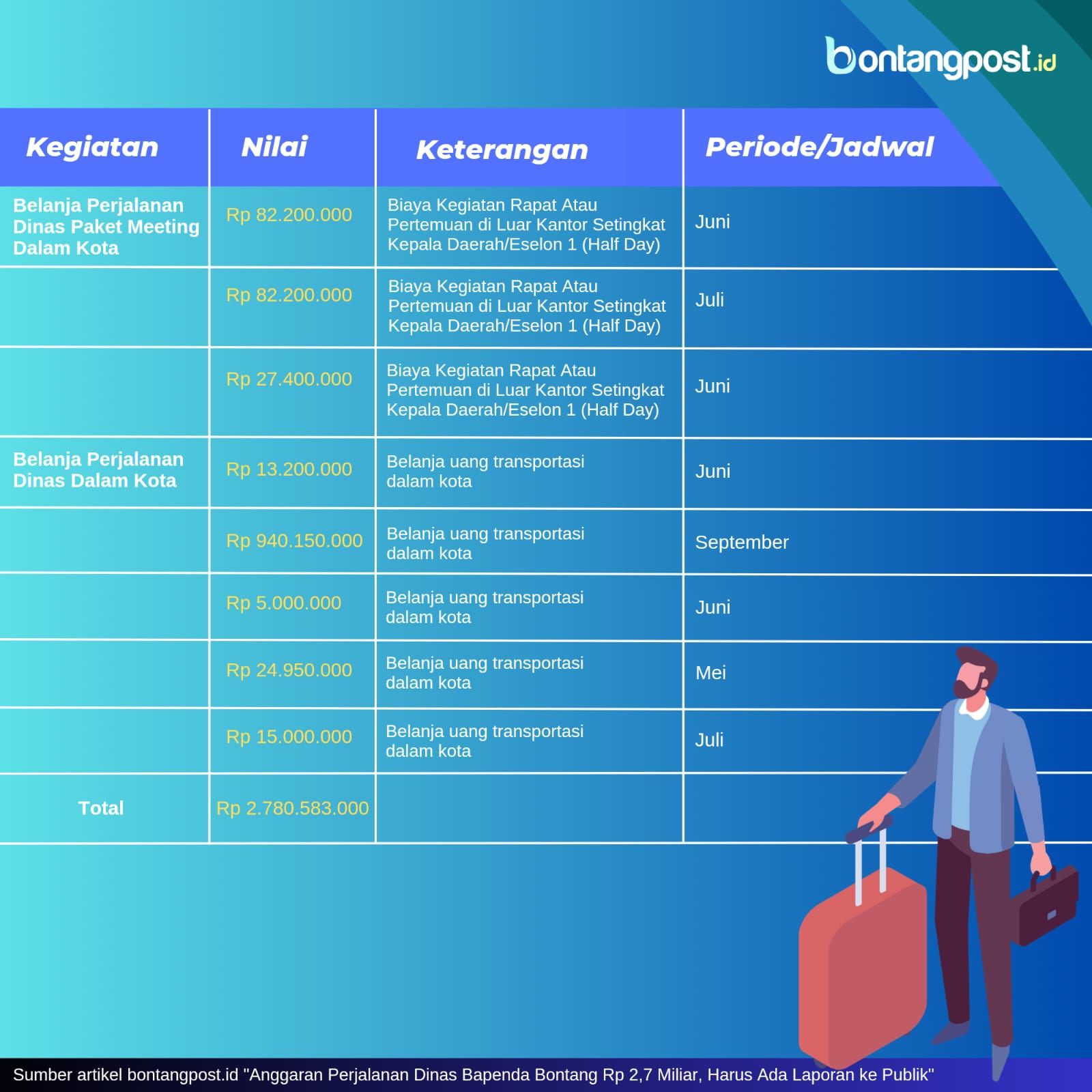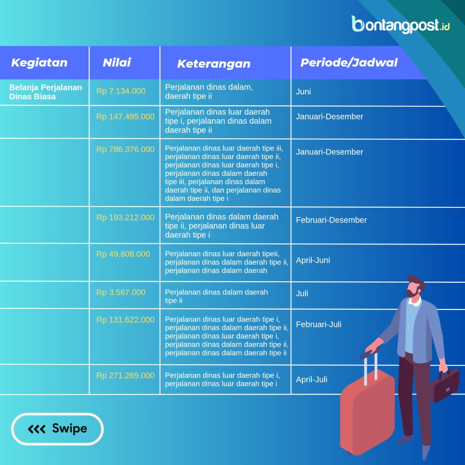 Dilansir dari Sistem Informasi Rencana Umum Pengadaan (Sirup), rencana anggaran bimtek Bapenda sebesar Rp 112,5 juta dengan alokasi anggaran perjalanan dinas sekira Rp 2,78 miliar yang bersumber dari APBD.