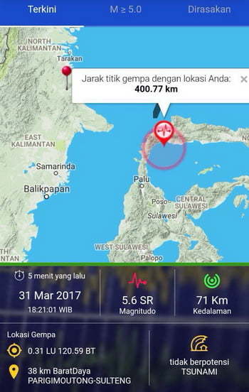 SANGATTA – Sekira pukul 19.21 wita, kemarin (31/3), Kutim di goyang gempa sebanyak dua kali. Menurut laporan, gempa menyasar Sangatta dan kawasan Sangkulirang. Umumnya, di daerah pesisir laut. Meskipun tidak secara langsung, derasnya getaran turut membuat rumah bergoyang. Hal ini karena, gempa yang menuju titik sasar di Sulawesi Tengah tersebut sebesar 5,6 SR.