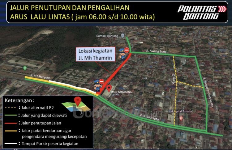 Pun, penutupan jalan dimulai pukul 06.00 hingga 10.00 pagi. Bagi warga dari arah Tanjung Limau menuju ke Jalan Ahmad Yani diharapkan menggunakan jalan alternatif yang menghubungkan hingga simpang 4 Bontang Baru alias simpang RS Amalia.