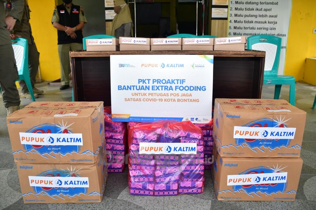 bontangpost.id – PT Pupuk Kalimantan Timur (PKT) menyalurkan paket extra fooding dan air mineral bagi para petugas di seluruh pos penjagaan PPKM Darurat. Itu sebagai tindak lanjut kontribusi penanganan dan pencegahan Covid-19 di Bontang. Bantuan diserahkan secara simbolis oleh VP CSR PKT Anggono Wijaya, kepada Kepala Satuan Polisi Pamong Praja (Satpol PP) Bontang Ibnu Gunawan, pada Selasa (13/7).