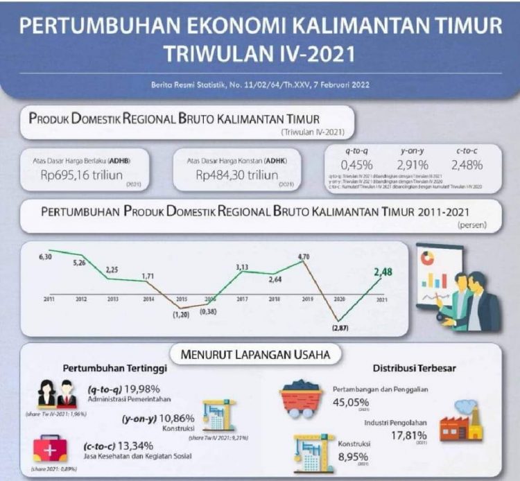 bontangpost.id – Ekonomi Provinsi Kalimantan Timur Triwulan IV-2021 mengalami pertumbuhan sebesar 2,91 persen. Pada triwulan ini, kinerja ekonomi Kalimantan Timur mengalami perbaikan dibandingkan dengan kinerja ekonomi pada Triwulan IV-2020 yang tumbuh negatif sebesar 2,88 persen.