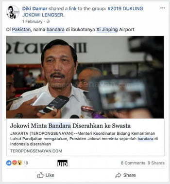Bukan hanya JawaPos.com. Sejumlah media mainstream lainnya memberitakan hal yang sama. Bahkan, ada media yang menyebutkan, cerita soal penamaan bandara Xi Jinping itu didapat Luhut dari Presiden Joko Widodo.