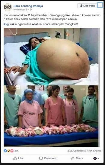 ’’Ibu ini melahirkan 11 bayi kembar. Semoga yang like, share, dan komen amin dikasih anak soleh solehah dan rezeki melimpah aamiin,’’ begitulah narasi yang di-posting fans page Rara Tentang Remaja.