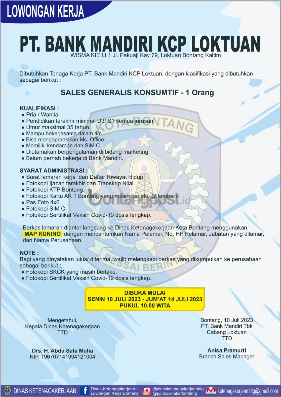 bontangpost.id – Bank Mandiri cabang Loktuan, Bontang Utara membuka lowongan pekerjaan untuk warga Bontang. Bank Mandiri mencari satu orang bagian Sales Generalis Konsumtif.