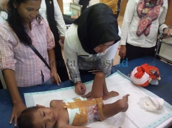 Di belakang tubuhnya ada luka pasca operasi berdiameter kurang lebih 10 sentimeter (cm) dari tulang ekor hingga punggung. Itu dikatakan bagian dari tindakan operasi lanjutan dokter di RSUD AWS Samarinda, sebab operasi usus melalui perutnya sudah menyulitkan tim medis. Pada bagian ketiak belakang tangan kanan, juga terdapat bekas luka pasca operasi, namun sudah tampak kering.