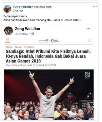 PREDIKSI Sandiaga Uno tentang prestasi Indonesia di Asian Games dijadikan bahan hasutan oleh produsen kabar hoax. Sebuah screenshot berita dengan judul “Sandiaga: Atlet Pribumi Kita Fisiknya Lemah, IQ-nya Rendah, Indonesia Gak Bakal Juara Asian Games 2018” ramai beredar di media sosial. Dalam screenshot itu, terlihat tulisan Liputan6. Lalu, ada tulisan nama akun Facebook Zeng Wei Jian.