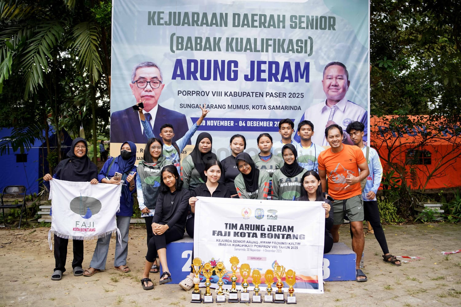 Tim Arung Jeram FAJI Bontang berfoto bersama sambil menampilkan trofi hasil raihan empat emas dan enam perunggu di BK Porprov 2025.