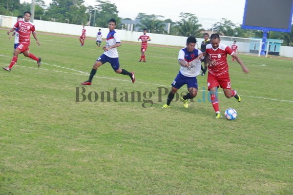 PERKASA: Pemain Sangkulirang FC, Ahmat Setiawan (jersey merah) mencoba masuk ke pertahanan Penajam Utama, yang di laga kemarin, berhasil menang dikandang sendiri dengan skor 2-0.(VERI SAKAL/SANGATTA POST)