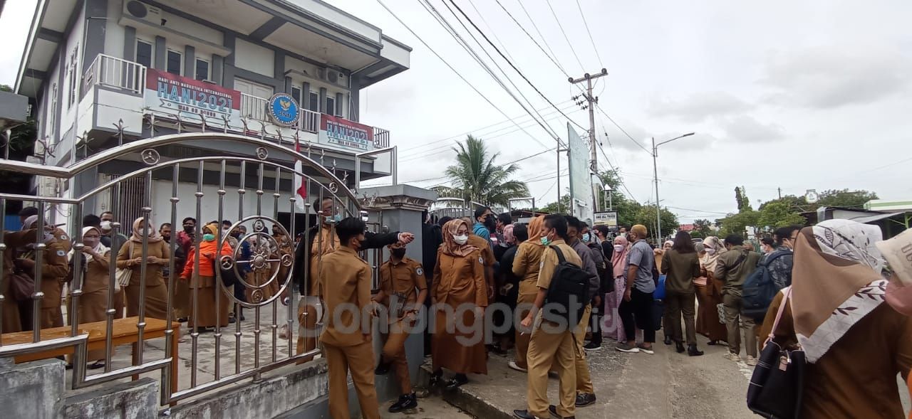 bontangpost.id – Ratusan tenaga kontrak daerah (TKD) Pemkot Bontang berdesakan di halaman kantor Badan Narkotika Nasional Kota (BNNK) Jalan Pattimura, Kelurahan Api-Api, Kecamatan Bontang Utara, Senin (3/1/2022) pagi. Mereka berdesakan untuk mengikuti tes narkotika.