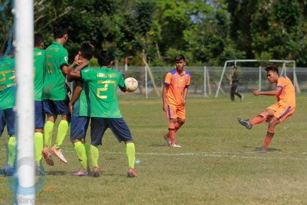 EKSEKUSI SEMPURNA: Tendangan bebas yang dilakukan oleh pemain PS PU Bontang Panji berhasil menggetarkan jala gawang Saturut Berau FC. Gol ini membuat tiga poin kembali diraih PS PU di 8 besar Liga 3 zona Kaltim.(FAHMI/BONTANG POS)