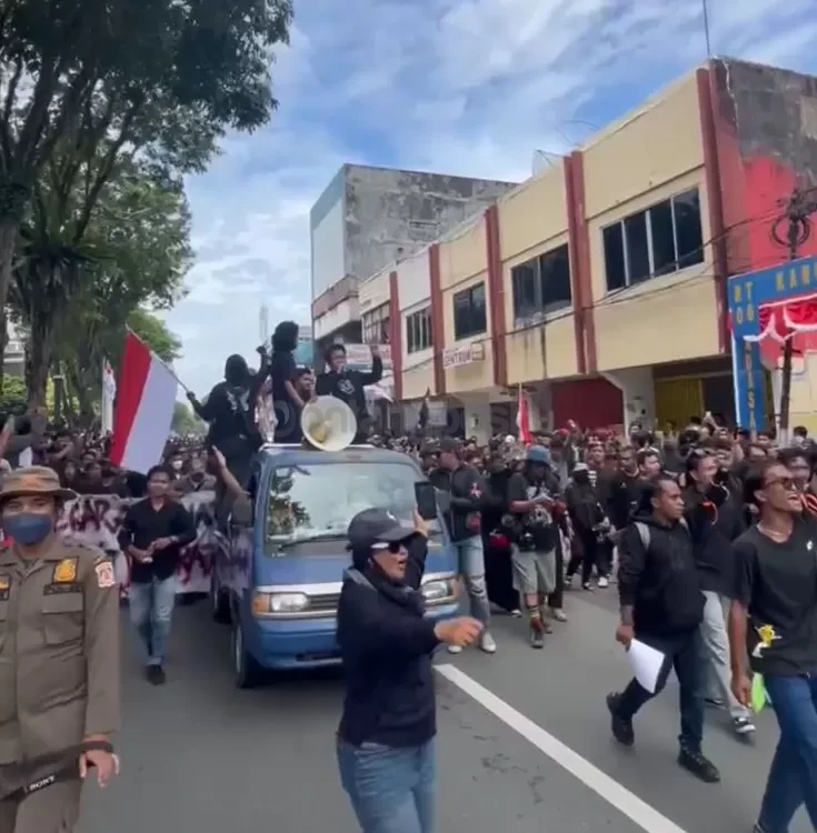 Massa gabungan mahasiswa dan masyarakat berlong march dari Simpang Plaza Balikpapan sejak pukul 13.00 Wita, sambil membawa bendera merah putih dan bendera One Piece.