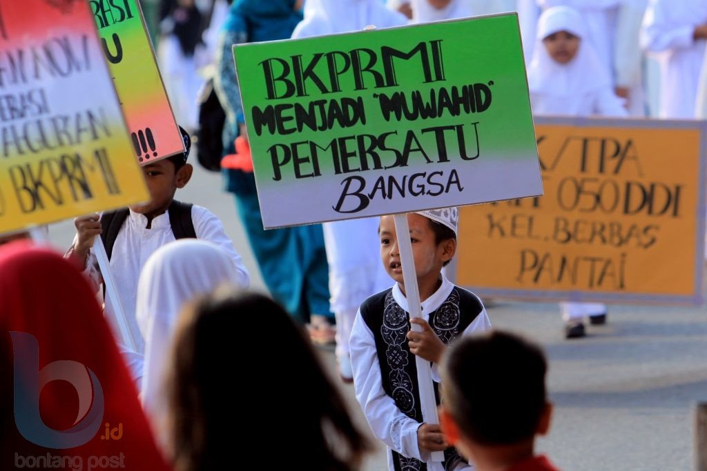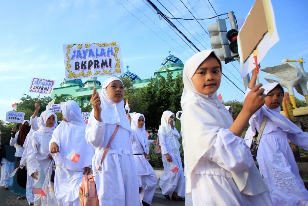Senyum ceria dan semangat mewarnai jalannya pawai taaruf dalam rangka HUT ke-41 Badan Koordinasi Pemuda Remaja Masjid Indonesia (BKPRMI) Bontang, Ahad (30/9) kemarin. Start dari Masjid Agung Al-Hijrah dan finis di Baitul Quran Pisangan, pawai ini diikuti ratusan orang yang terdiri dari santri TKA/TPA, para guru mengaji, serta IRMA se-Bontang. (bbg)