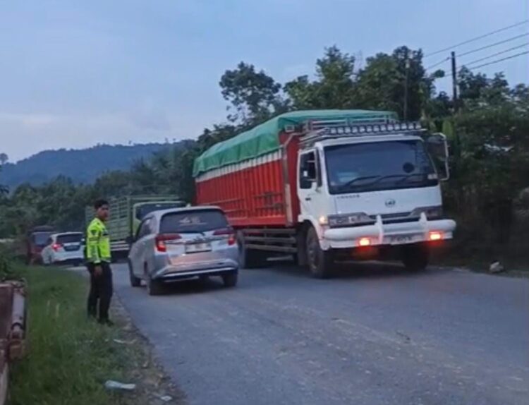 Namun, saat proses perbaikan berlangsung, truk justru mundur dan melintang di badan jalan, sehingga menyebabkan kemacetan arus lalu lintas.