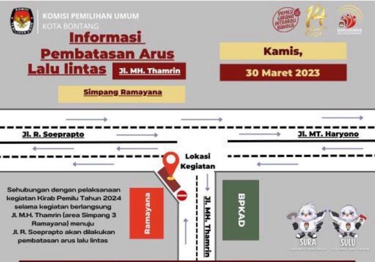 Akibatnya, aktivitas lalu lintas pengendara yang melintasi Jalan MH Thamrin menuju Jalan R Soeprapto bakal terganggu selama tiga jam lantaran adanya pembatasan arus lalu lintas. Yakni sejak pukul 16.00 hingga pukukl 18.00 sore.