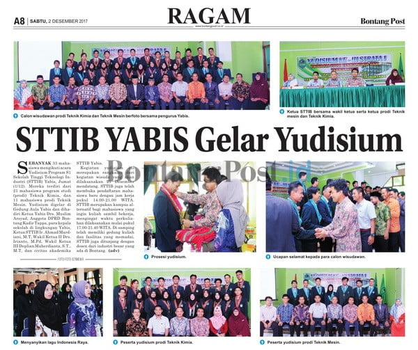 SEBANYAK 33 mahasiswa mengikuti acara Yudisium Program S1 Sekolah Tinggi Teknologi Industri (STTIB) Yabis, Jumat (1/12). Mereka terdiri dari 21 mahasiswa program studi (prodi) Teknik Kimia, dan 11 mahasiswa prodi Teknik Mesin. Yudisium digelar di Gedung Aula Yabis dan dihadiri Ketua Yabis Drs. Muslim Arsyad, Anggota DPRD Bontang Kadir Tappa, para kepala sekolah di lingkungan Yabis, Ketua STTIB Ir. Ahmad Mardiani, M.T, Wakil Ketua II Drs. Irianto, M.Pd, Wakil Ketua III Deplian Maherdianta, S.T., M.T, dan civitas akademika STTIB Yabis.