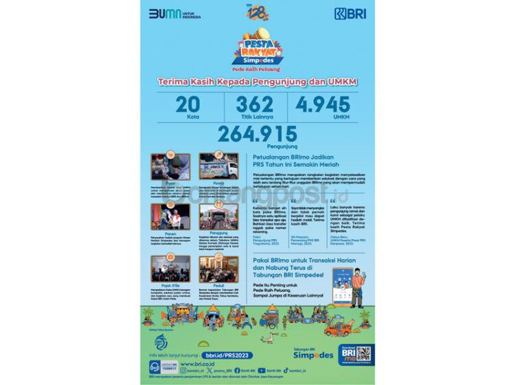 Mengusung tema “Pede Raih Peluang’, PRS 2023 yang diselenggarakan Tabungan Simpedes BRI di 362 titik dengan menggandeng 4.945 UMKM mampu memikat 264.915 pengunjung.