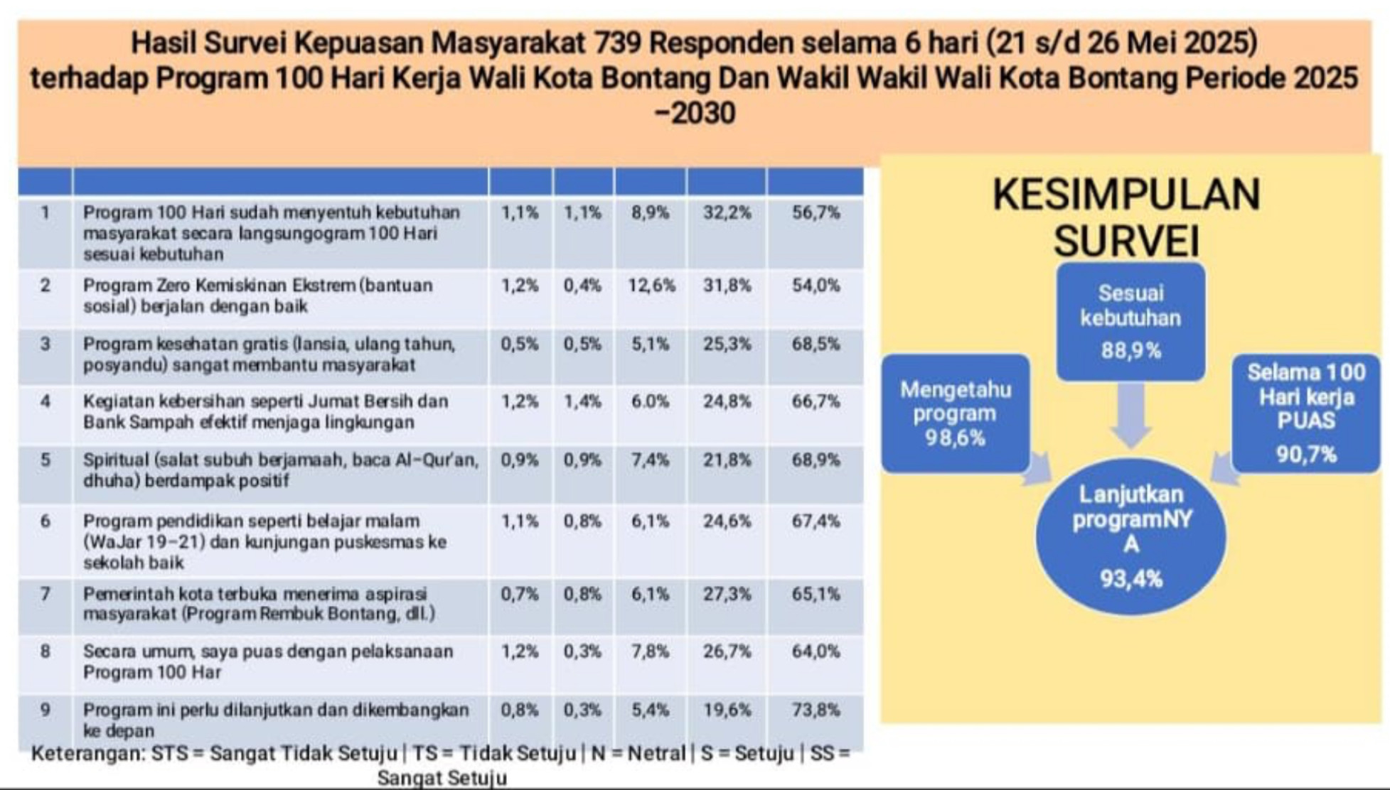 Survei digelar selama enam hari mulai 21-26 Mei 2025. Responden diberi pertanyaan sama. Yakni, “Secara umum, saya puas dengan pelaksanaan Program 100 Kerja?”