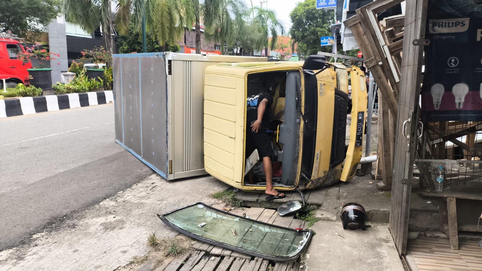 BONTANGPOST.ID, Bontang – Kecelakaan lalu lintas tunggal terjadi di Jalan Brigjen Katamso, tepatnya di depan Bontang Plaza, Rabu (7/1/2026). Sebuah truk box dilaporkan terguling di depan toko Kaca Asia Aluminium.