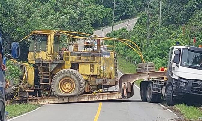 BONTANGPOST.ID, Bontang – Sebuah truk trailer pengangkut alat berat melintang di Jalan Poros Bontang–Samarinda, tepatnya di dekat simpang Marangkayu, Kukar, Selasa (4/11/2025) siang.