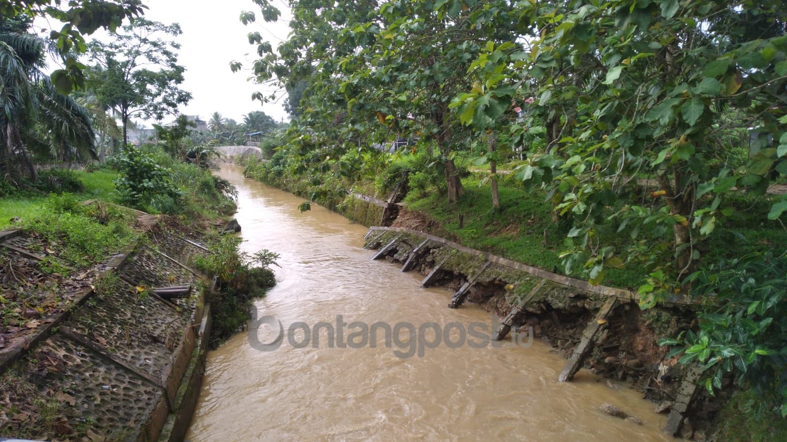 Terlihat turap tersebut ambruk dan terpisah dari sambungan turap di sampingnya. Hal itu membuat bongkahan turap merosot ke dalam sungai. Sehingga tanah maupun bebatuan yang berada di sekitarnya ikut amblas.