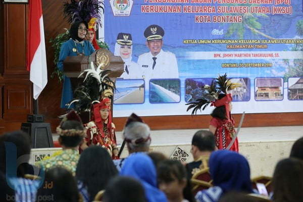 BONTANG – Wali Kota Bontang Neni Moerniaeni menghadiri Pengukuhan Badan Pengurus Daerah (BPD) Kerukunan Keluarga Sulawesi Utara (KKSU) Bontang periode 2018-2023, Minggu (30/9). Bertempat di Auditorium Taman 3 Dimensi Jalan Awang Long, Bontang Utara, sebanyak 90 pengurus KKSU Bontang dikukuhkan.